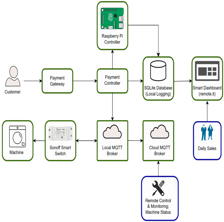 Smart Switching: Integrated with Sonoff Smart Switches connected to each machine’s power line for precise remote start/stop control and status monitoring.